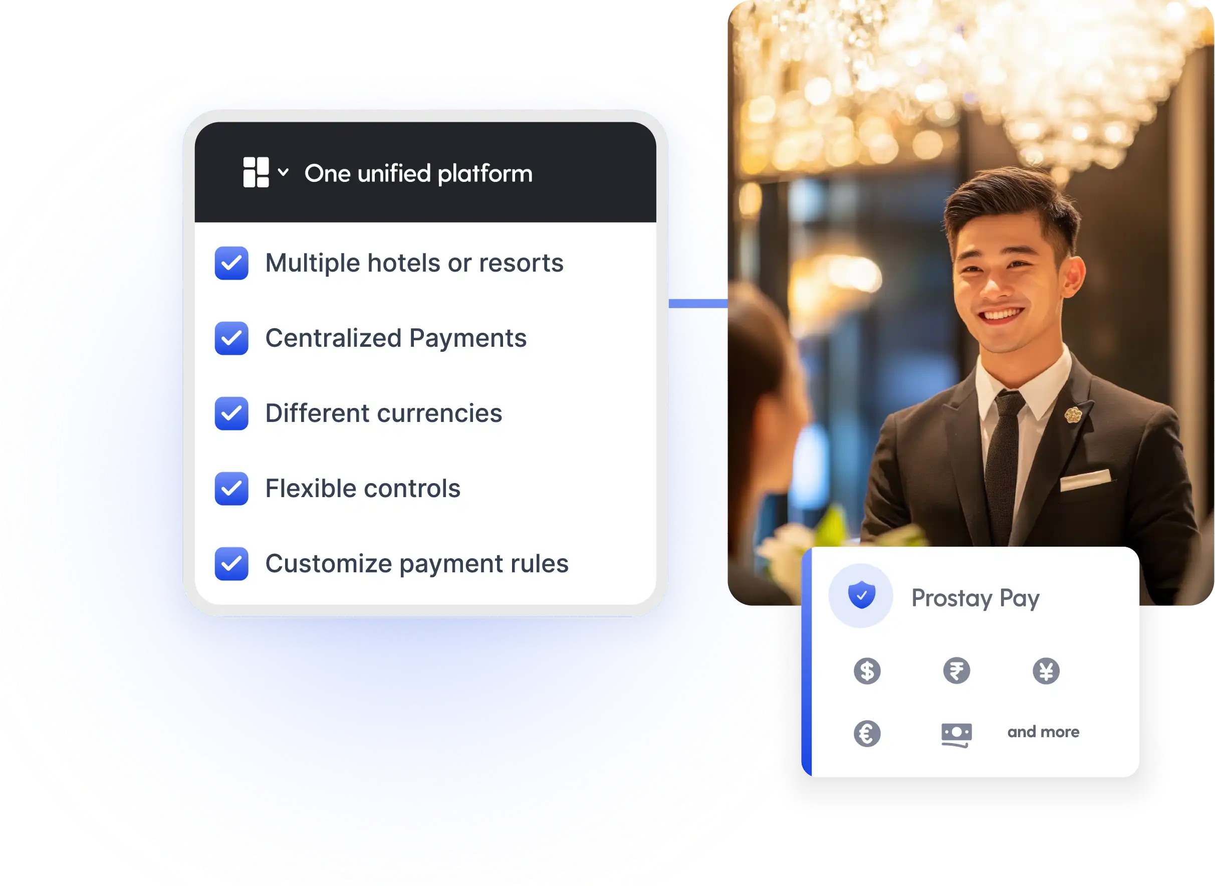 Whether you’re running a small group of boutique properties or overseeing operations across regions, Prostay Pay gives you centralized control with property-level flexibility. View consolidated reports, customize payment rules per property, and settle funds in different currencies — all while maintaining full visibility across your portfolio.
