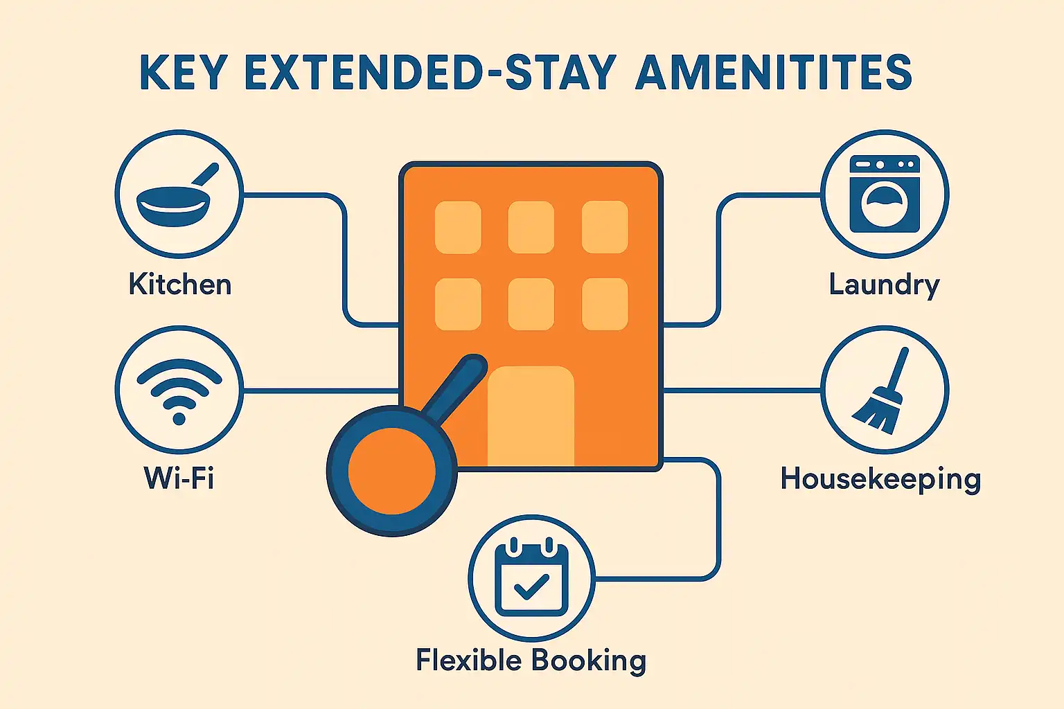 Important amenities include a fully-equipped kitchenette or in-suite kitchen, Wi-Fi, workspace/desk, laundry facilities, comfortable living areas, and flexible check-in/out or stay extension options.