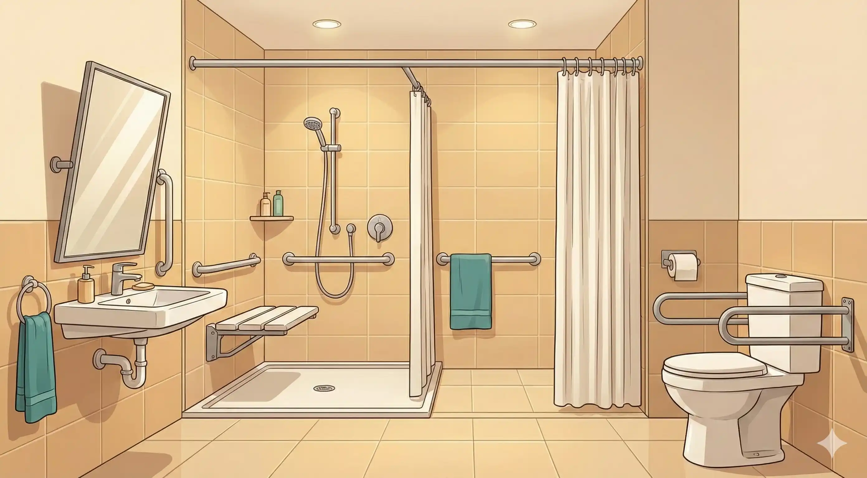 When it comes to accessibility, certain layout details are essential. Doors usually need to be at least 32–36 inches (81–91 cm) wide to comfortably accommodate wheelchairs. Spaces where guests need to turn around, like bathrooms or beside beds, require about 150 cm of clear floor area. Roll-in showers must be designed without curbs and include grab bars placed at specific heights for safety.
