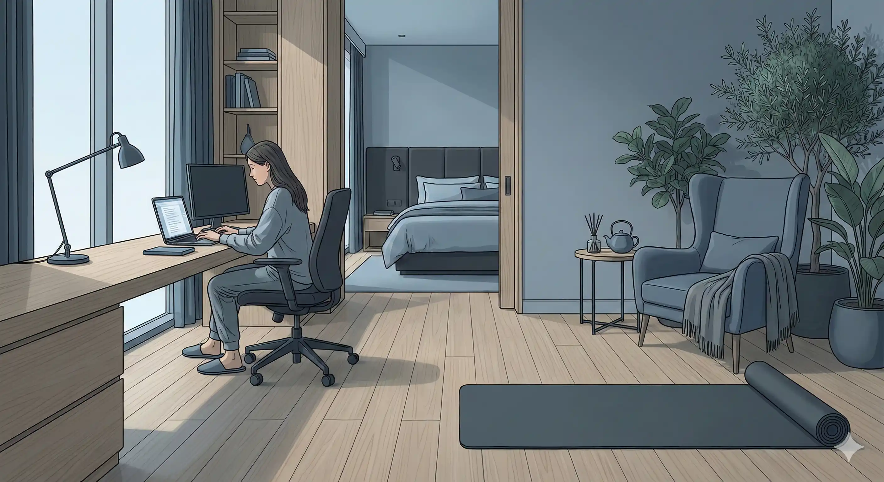 In smaller rooms, zones often overlap thanks to multifunctional furniture—like a wall-mounted desk that doubles as a vanity or storage ottomans that also serve as seating and hide sofa beds. Acoustic zoning becomes even more important here to keep work areas quiet and separate from noisy building systems.