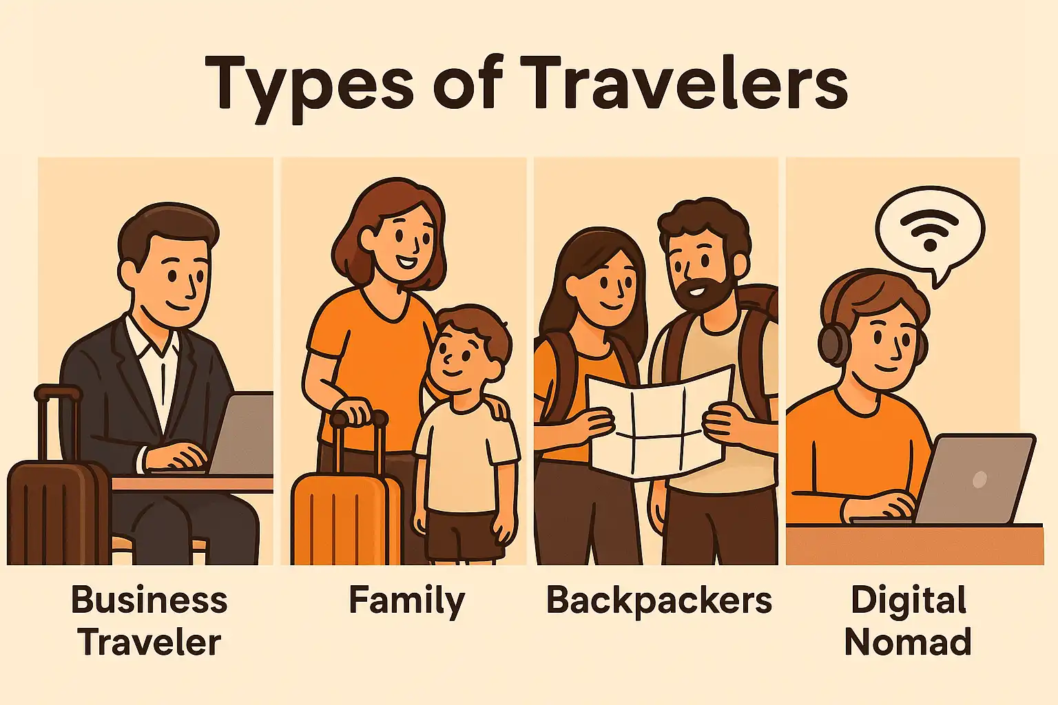 Common traveller types include business travellers, leisure guests (families or couples), digital nomads/remote workers, solo travellers, luxury travellers, and budget-sensitive guests.