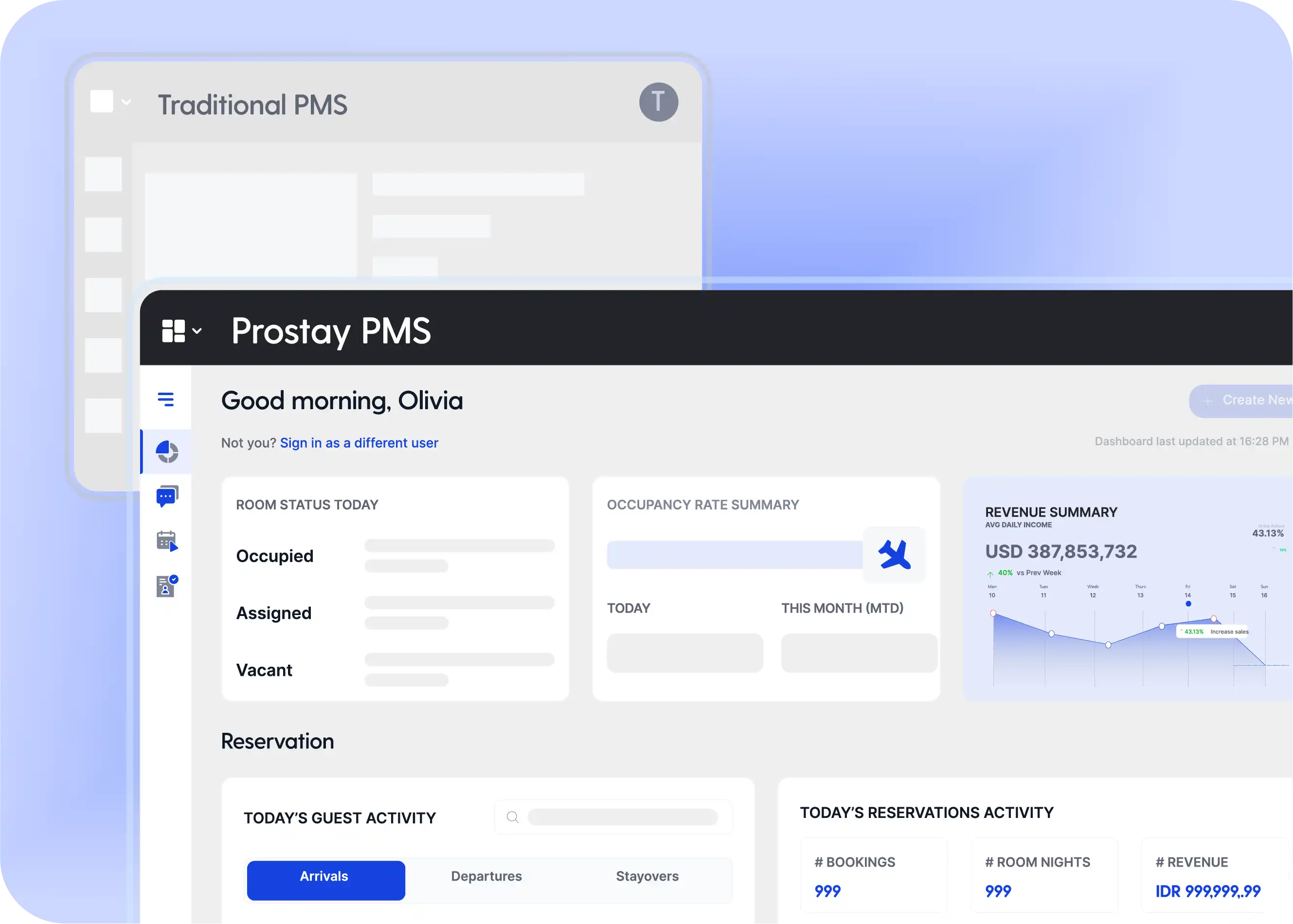 El sistema de gestión hotelera (PMS) de Prostay es el núcleo de operaciones, diseñado para simplificar y optimizar cada aspecto de la gestión de su propiedad. Tanto si se trata de la gestión de un establecimiento pequeño como de un gran resort o unos cuantos alojamientos vacacionales, nuestro PMS reúne todas las herramientas esenciales en una plataforma intuitiva.